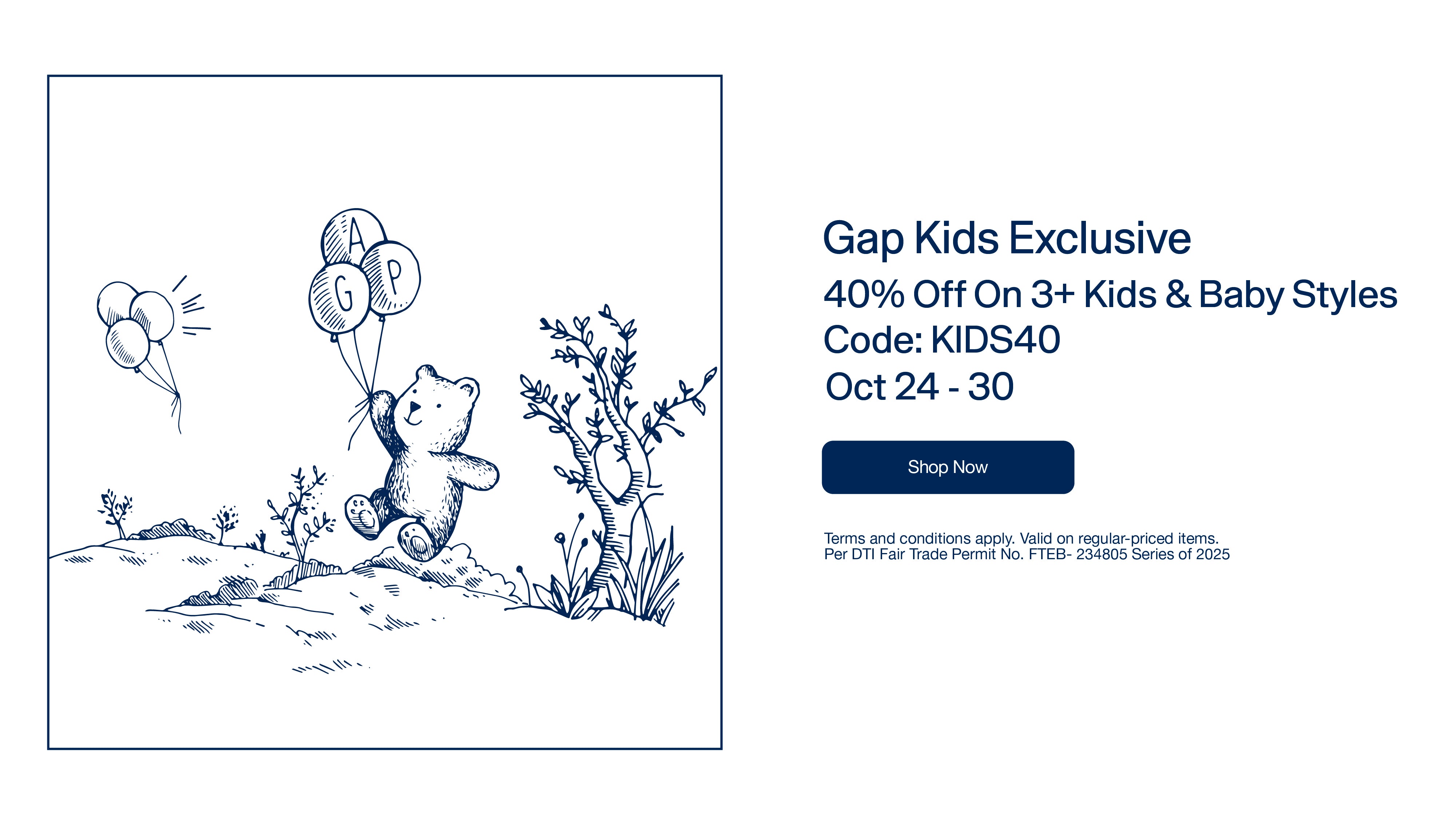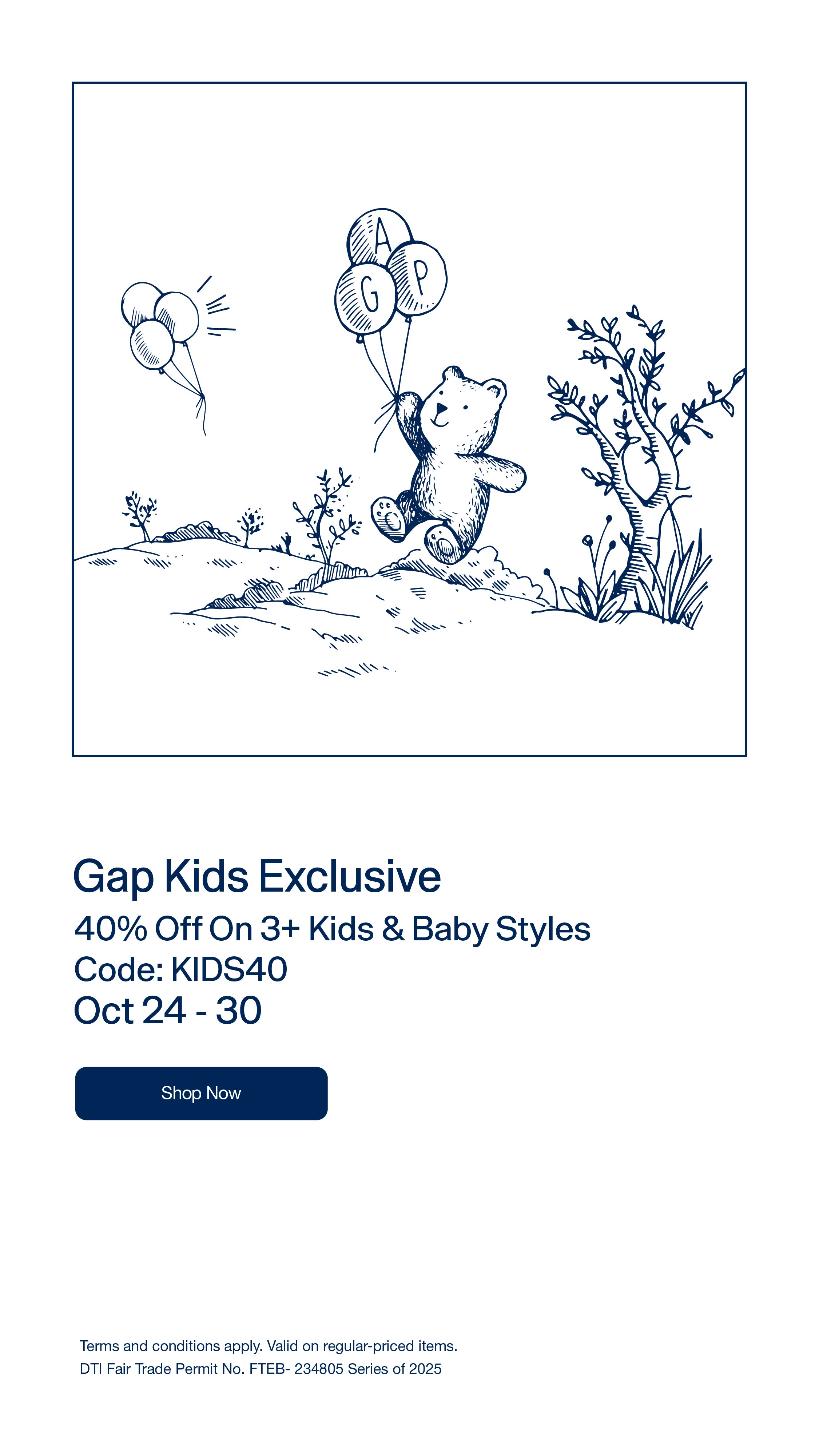 - Enjoy 40% off on 3 or more regular-priced kid’s & baby styles.