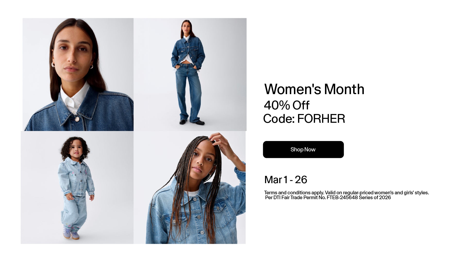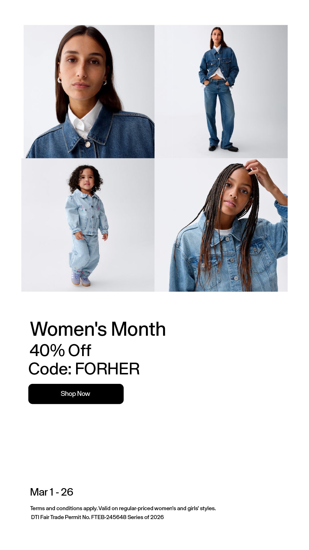 - Offer is stackable with code FORHER - 40% off on regular-priced styles for women and girls.