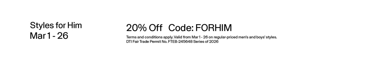 - Offer is stackable with code FORHIM - 20% off on regular-priced styles for men and boys.